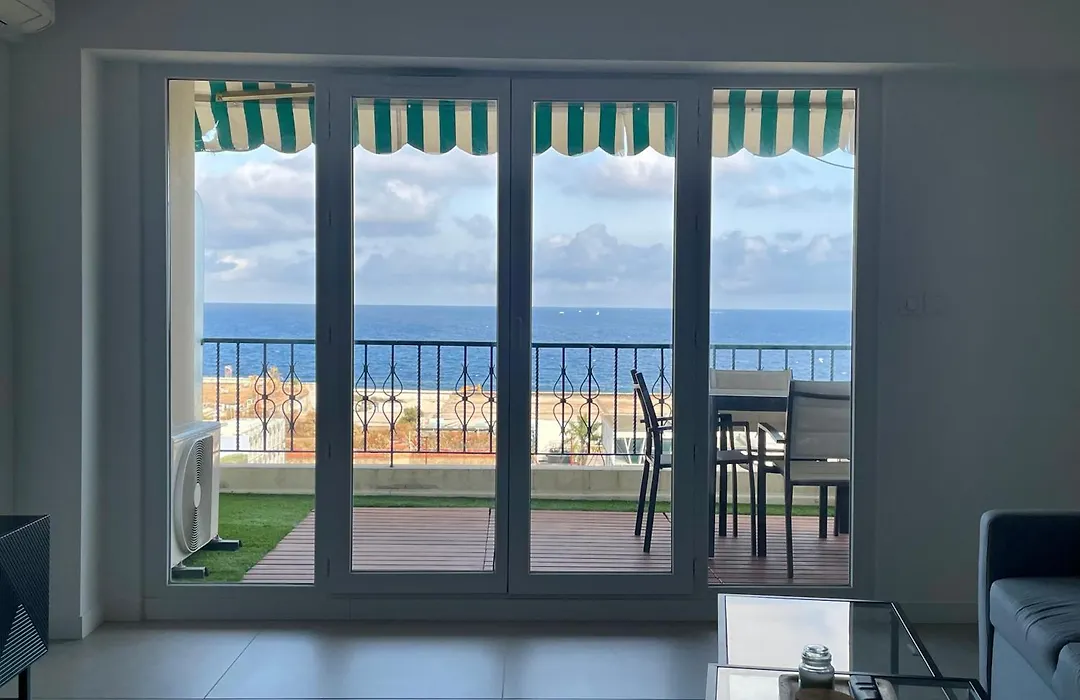 Appartement Vue Mer Nice overlooks the sea and comprises a dressing area and a fully equipped kitchen with air conditioning. Hair dryers and bath sheets can also be found.